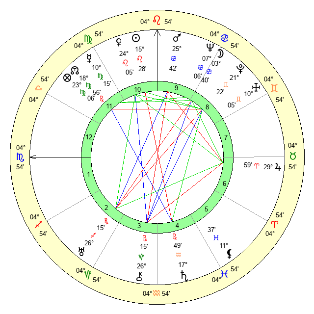 | Mercury | 10 Virgo 16 | 4 Leo 40 | 4 Capricorn 2 |