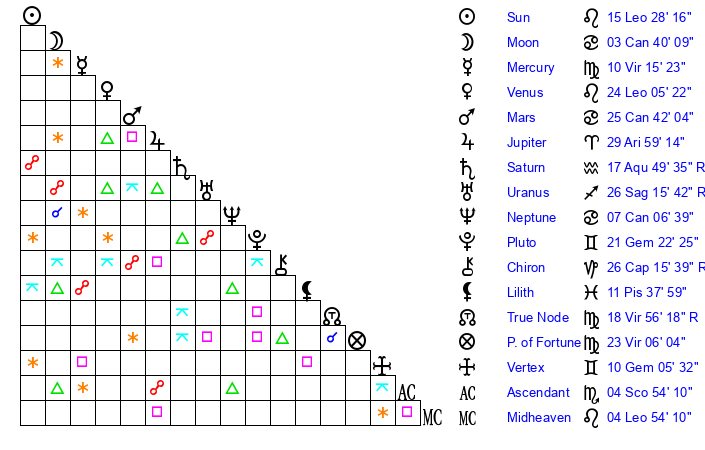 | Sun | 15 Leo 28 | 16 Leo 12 | 14 Sagittarius 59 |