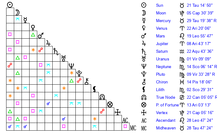 | Neptune | 14 Scorpio 5 | 1 Aries 26 | 12 Scorpio 55 |