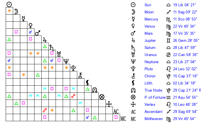 | Saturn | 29 Libra 16 | 26 Pisces 48 | 7 Scorpio 17 |