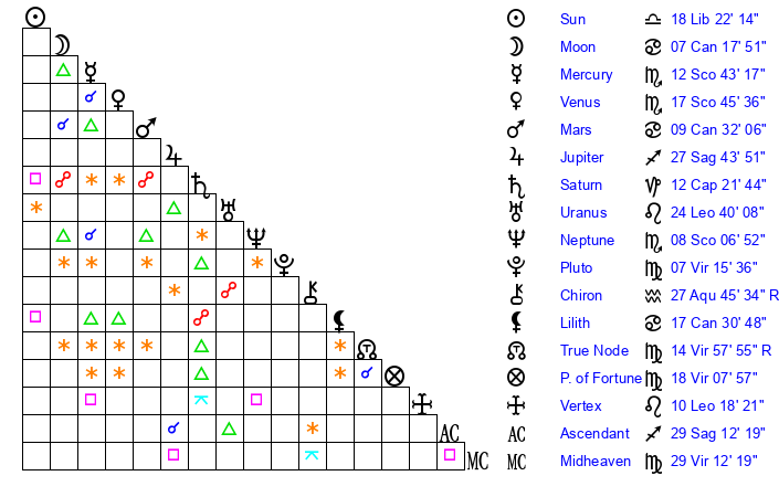 | Pluto | 7 Virgo 15 | 1 Aquarius 21 | 8 Virgo 7 |