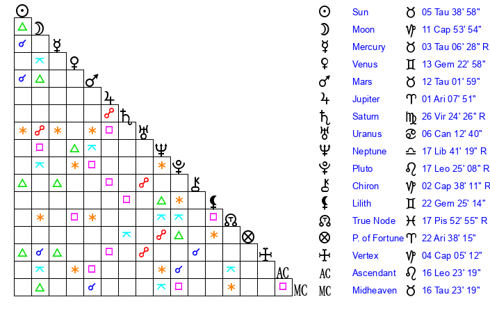 | Moon | 11 Capricorn 52 | 21 Aries 2 | 16 Virgo 44 |