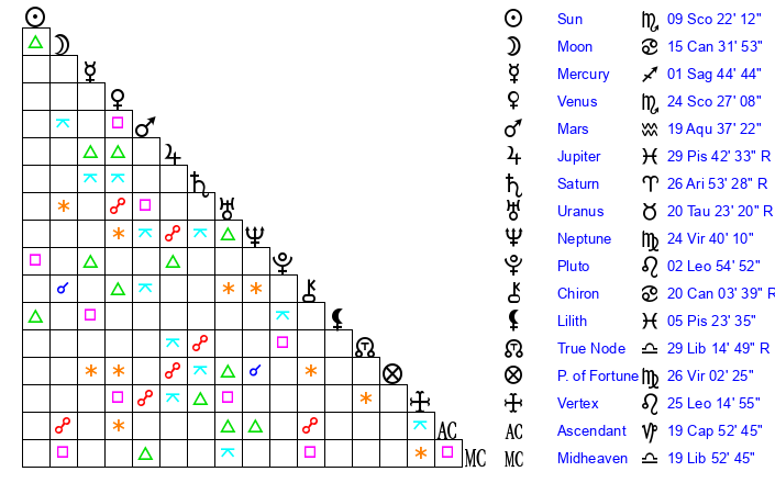 | Sun | 9 Scorpio 22 | 10 Scorpio 31 | 6 Aquarius 37 |