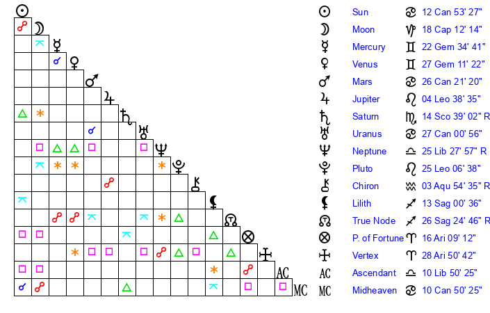 | Moon | 18 Capricorn 18 | 15 Scorpio 30 | 17 Leo 25 |