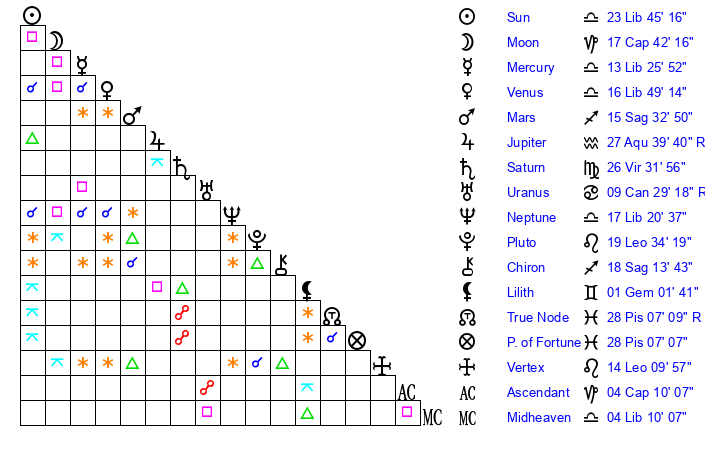 | Sun | 23 Libra 45 | 24 Libra 34 | 9 Capricorn 28 |