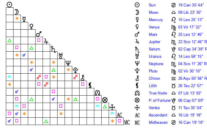 | Moon | 9 Libra 24 | 12 Aquarius 59 | 19 Pisces 2 |