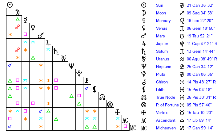 | Neptune | 25 Cancer 34 | 2 Aries 8 | 28 Cancer 14 |