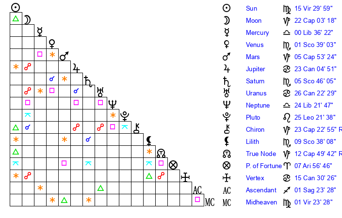| Moon | 22 Capricorn 3 | 28 Pisces 56 | 11 Virgo 3 |