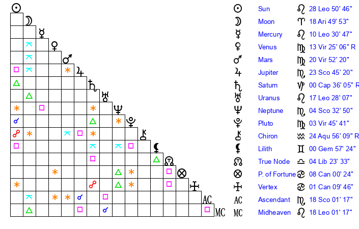 | Moon | 18 Aries 51 | 23 Leo 4 | 7 Virgo 15 |