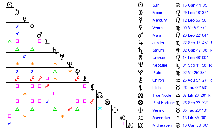 | Pluto | 2 Virgo 25 | 2 Aquarius 56 | 4 Virgo 29 |