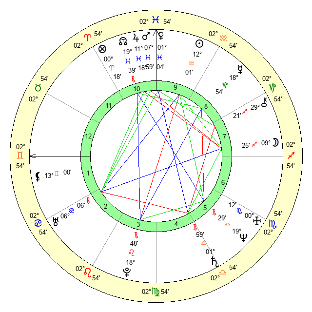 | Sun | 12 Aquarius 2 | 13 Aquarius 5 | 25 Aries 54 |