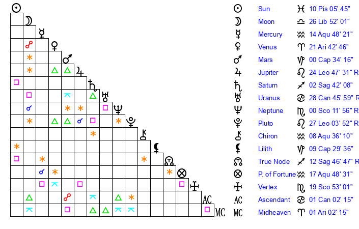 | Moon | 26 Libra 51 | 4 Aries 18 | 23 Aries 56 |