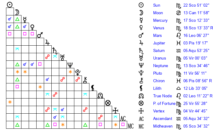 | Moon | 13 Cancer 9 | 3 Libra 37 | 25 Libra 10 |