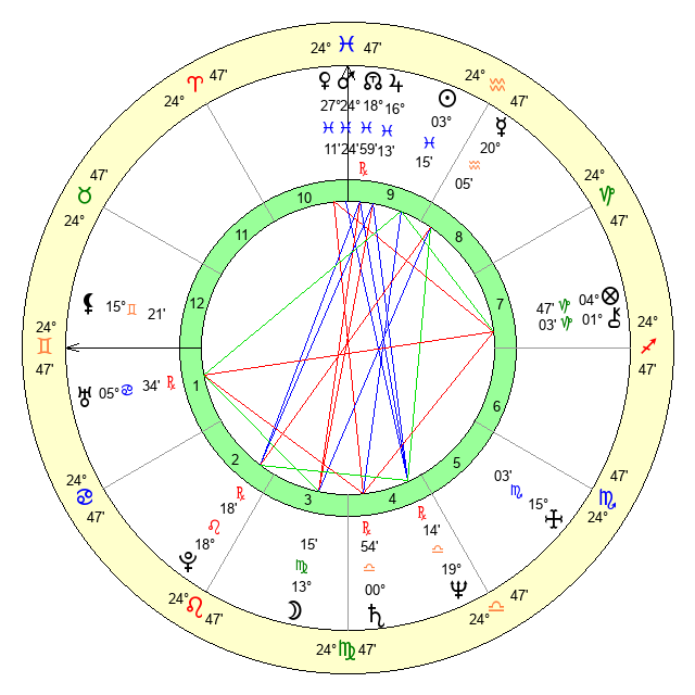 | Moon | 13 Virgo 19 | 26 Sagittarius 33 | 4 Gemini 29 |