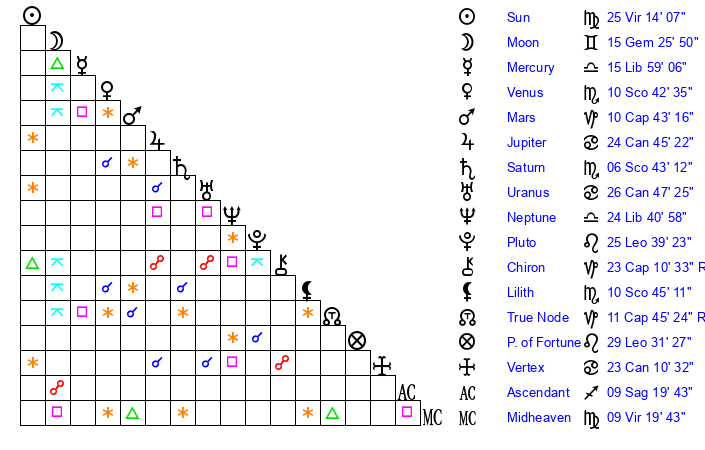 | Sun | 25 Virgo 14 | 26 Virgo 2 | 5 Sagittarius 56 |