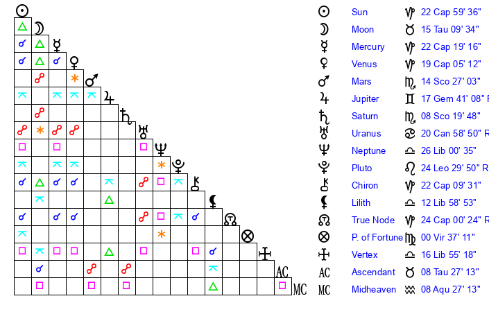 | Mercury | 22 Capricorn 19 | 7 Capricorn 40 | 6 Pisces 55 |