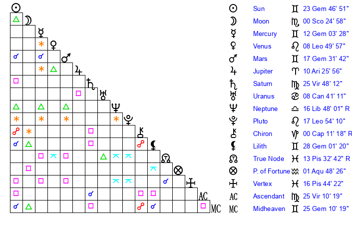 | Sun | 23 Gemini 46 | 24 Gemini 50 | 4 Virgo 34 |
