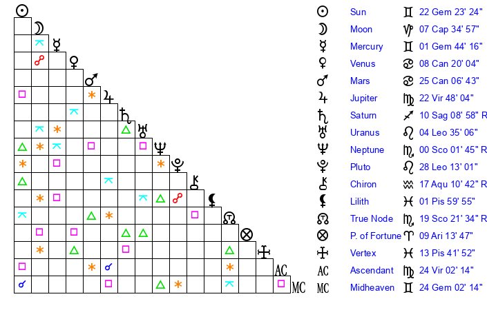 | Sun | 22 Gemini 23 | 22 Gemini 56 | 27 Leo 23 |
