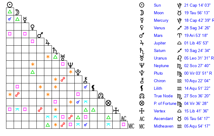 | Moon | 20 Taurus 0 | 23 Gemini 27 | 0 Sagittarius 33 |
