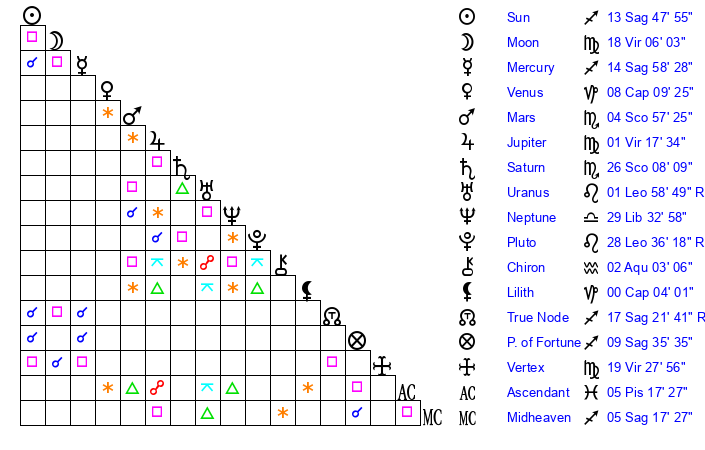 | Sun | 13 Sagittarius 48 | 14 Sagittarius 49 | 24 Aquarius 59 |