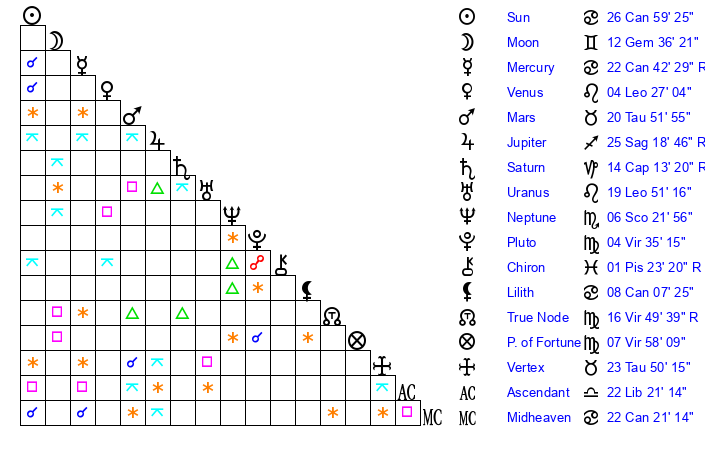 | Mercury | 22 Cancer 42 | 15 Leo 29 | 16 Libra 53 |