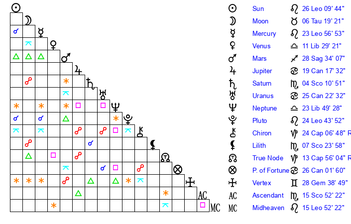 | Pluto | 24 Leo 44 | 2 Aquarius 0 | 26 Leo 34 |