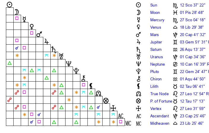 | Saturn | 26 Aquarius 42 | 25 Pisces 29 | 6 Pisces 55 |