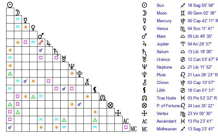 | Saturn | 13 Libra 48 | 25 Pisces 13 | 14 Libra 45 |