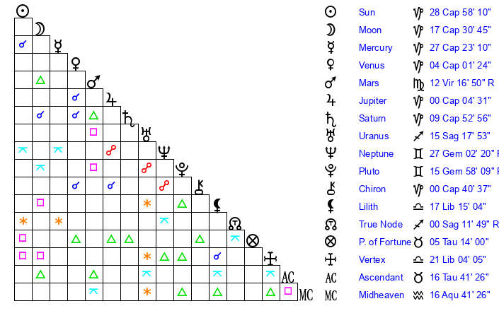 | Saturn | 10 Capricorn 21 | 16 Pisces 5 | 16 Capricorn 20 |