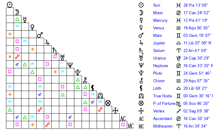 | Sun | 28 Pisces 13 | 29 Pisces 20 | 19 Cancer 26 |