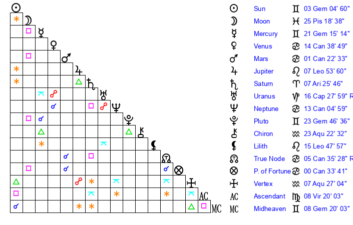 | Sun | 3 Gemini 5 | 3 Gemini 46 | 25 Virgo 21 |