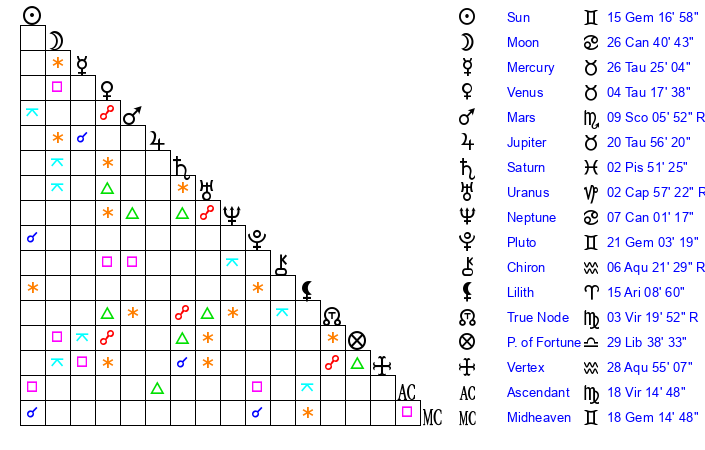 | Sun | 15 Gemini 17 | 16 Gemini 14 | 10 Libra 47 |
