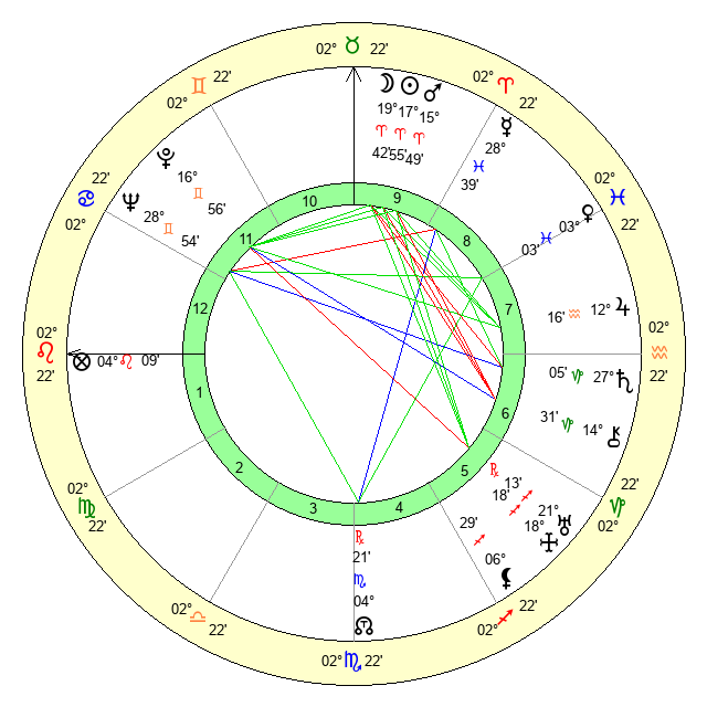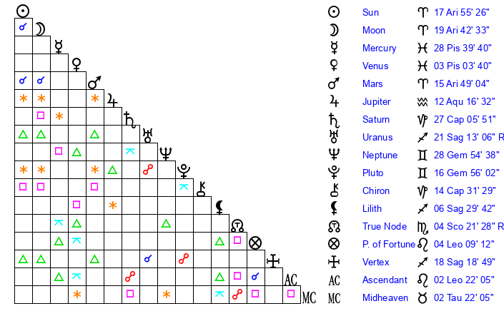 | Sun | 17 Aries 55 | 19 Aries 6 | 16 Leo 8 |