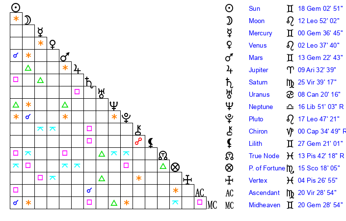 | Jupiter | 9 Aries 24 | 29 Gemini 58 | 13 Aries 26 |