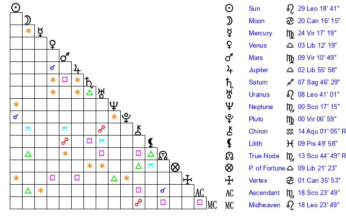 | Pluto | 0 Virgo 6 | 1 Aquarius 56 | 2 Virgo 0 |