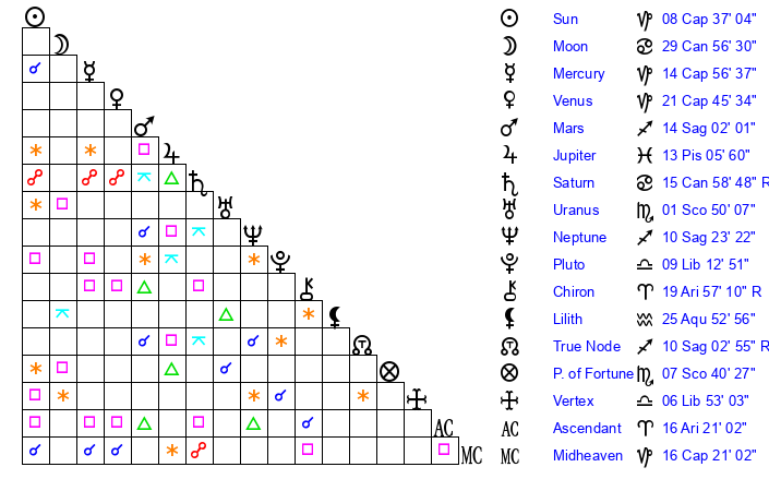 | Neptune | 10 Sagittarius 22 | 27 Pisces 16 | 11 Sagittarius 37 |