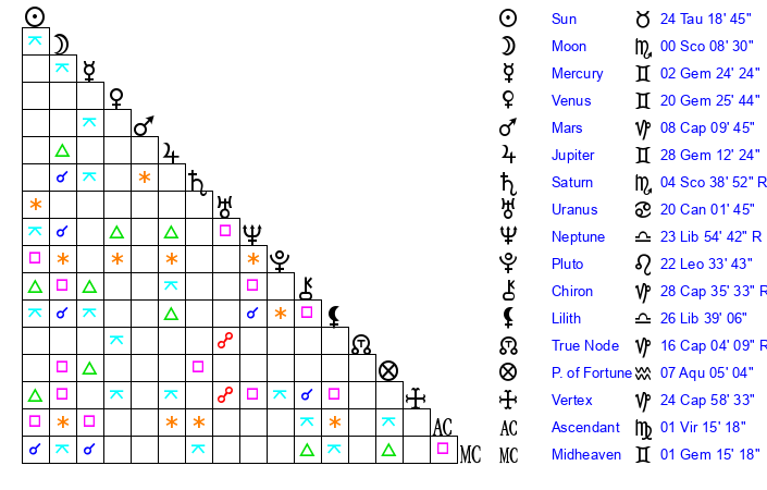 | Moon | 0 Scorpio 6 | 28 Sagittarius 30 | 7 Gemini 50 |