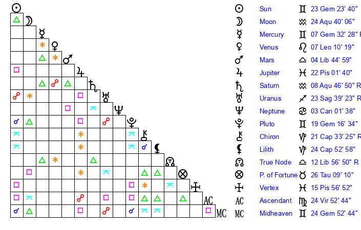 | Pluto | 19 Gemini 17 | 3 Aquarius 25 | 20 Gemini 36 |