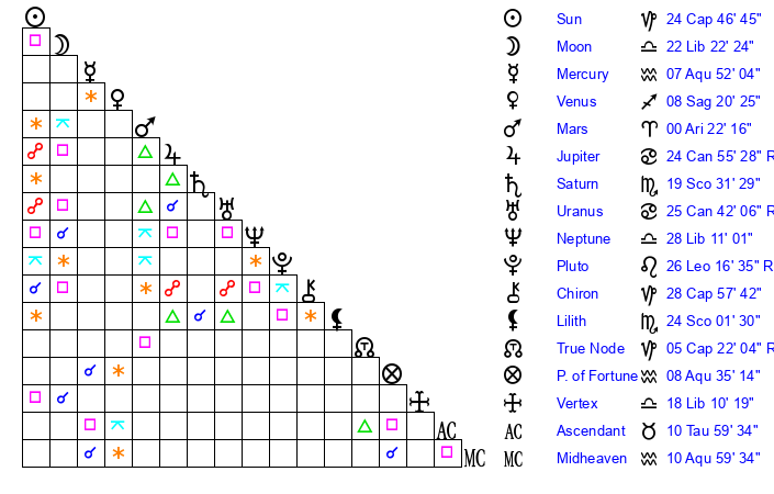 | Sun | 24 Capricorn 46 | 25 Capricorn 48 | 5 Aries 15 |