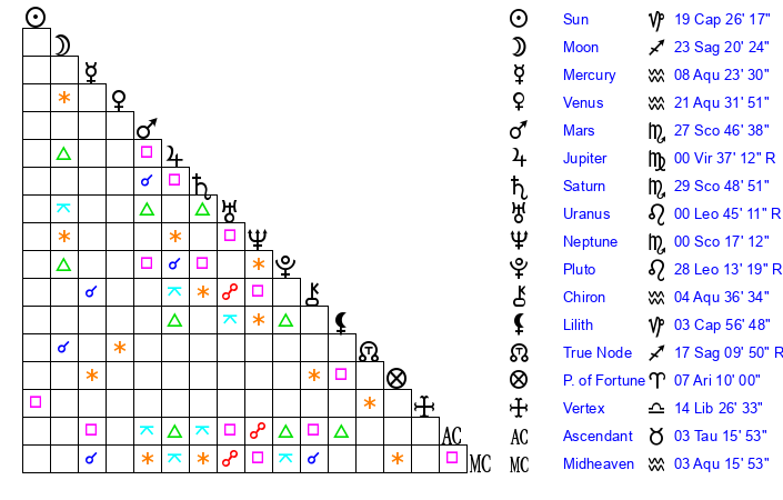 | Venus | 21 Aquarius 32 | 21 Capricorn 25 | 14 Taurus 23 |