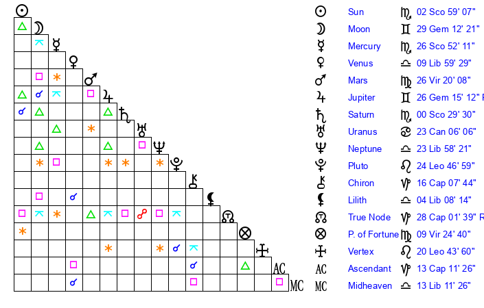| Mercury | 26 Scorpio 52 | 27 Scorpio 2 | 10 Capricorn 59 |