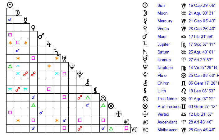 | Moon | 20 Aquarius 58 | 27 Aries 1 | 11 Gemini 57 |