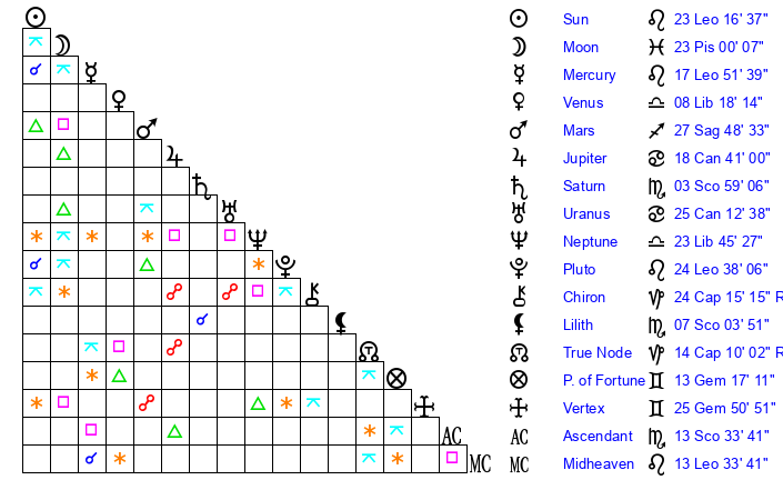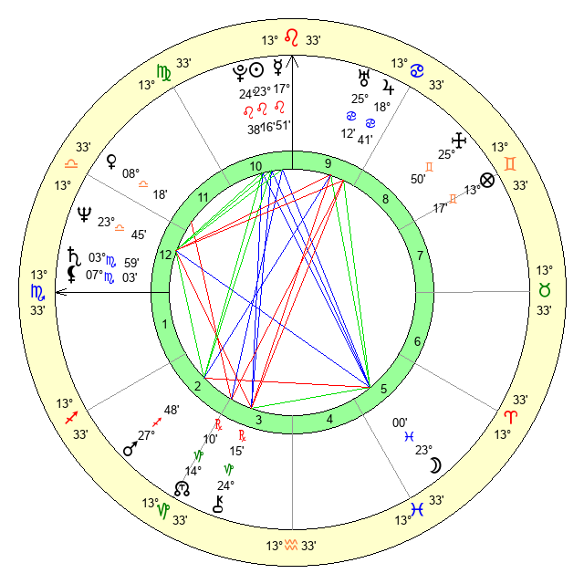 | Sun | 23 Leo 16 | 24 Leo 5 | 2 Scorpio 44 |