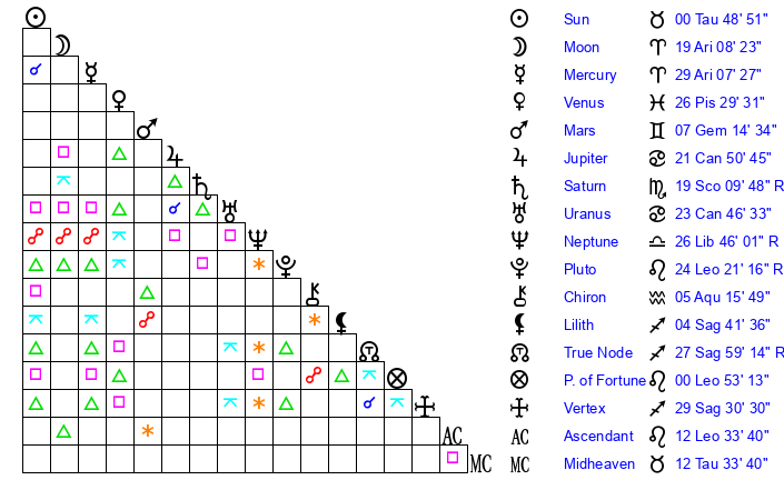 | Moon | 19 Aries 6 | 9 Aquarius 29 | 18 Scorpio 56 |