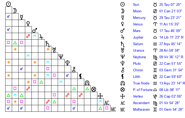 | Uranus | 28 Aries 59 | 27 Taurus 14 | 1 Taurus 25 |