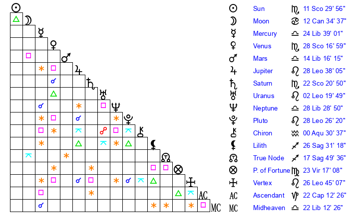 | Sun | 11 Scorpio 30 | 12 Scorpio 32 | 22 Capricorn 29 |