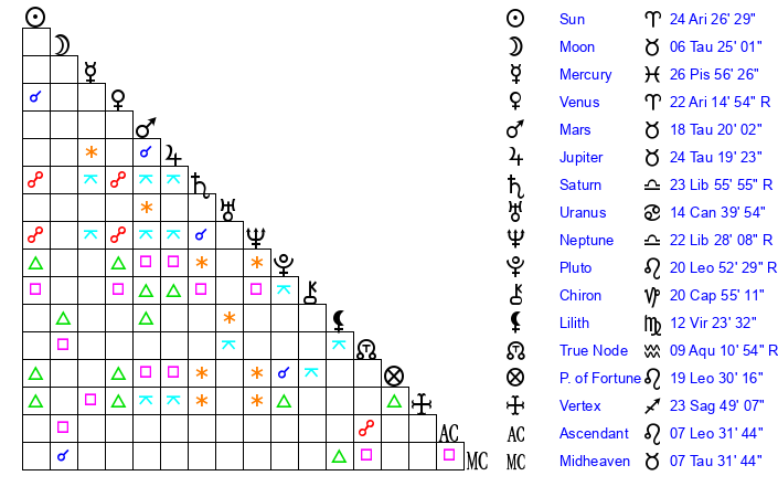 | Venus | 22 Aries 15 | 24 Pisces 42 | 18 Taurus 10 |