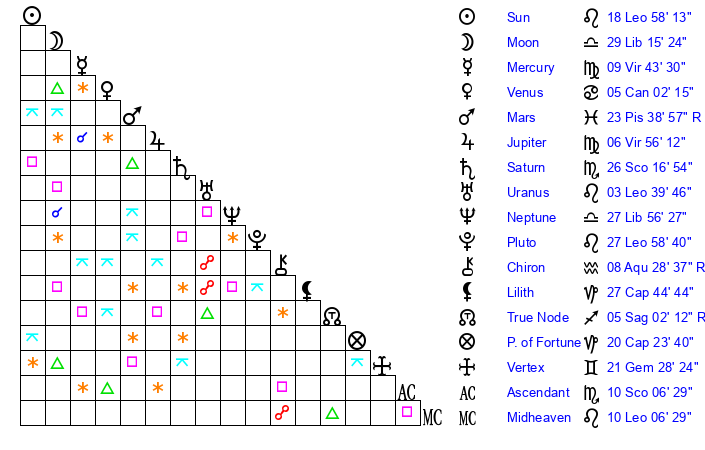 | Moon | 29 Libra 24 | 19 Pisces 42 | 26 Aries 5 |