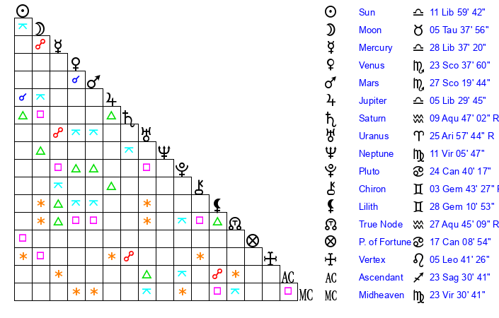 | Moon | 5 Taurus 38 | 22 Pisces 50 | 7 Virgo 30 |