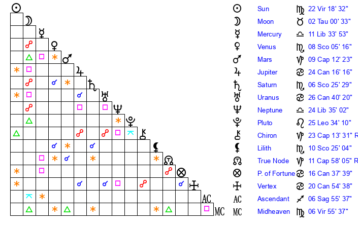 | Sun | 22 Virgo 18 | 23 Virgo 6 | 2 Sagittarius 54 |
